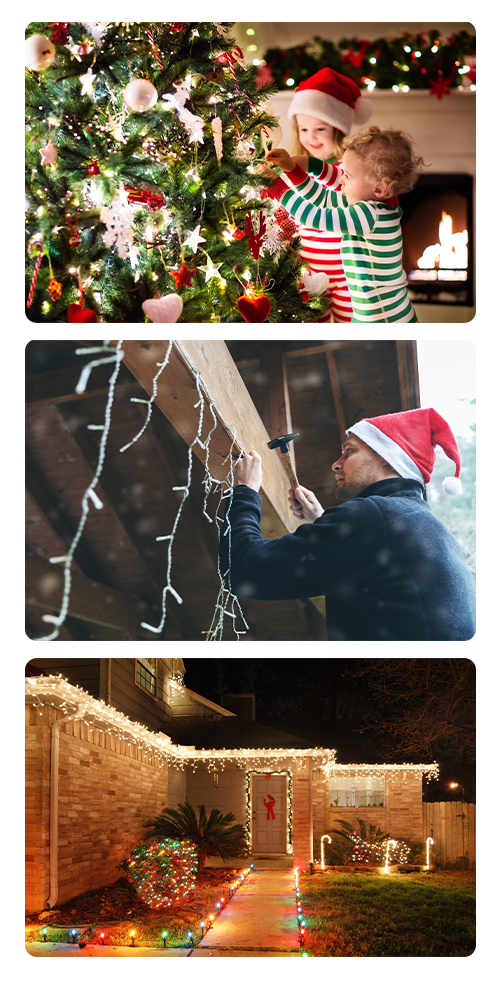 - Am Haus: Am Giebel des Hauses sorgt ein funkelnder Eisregen für eine stimmungsvolle Umrahmung und taucht Ihr Zuhause in festlichen Glanz.